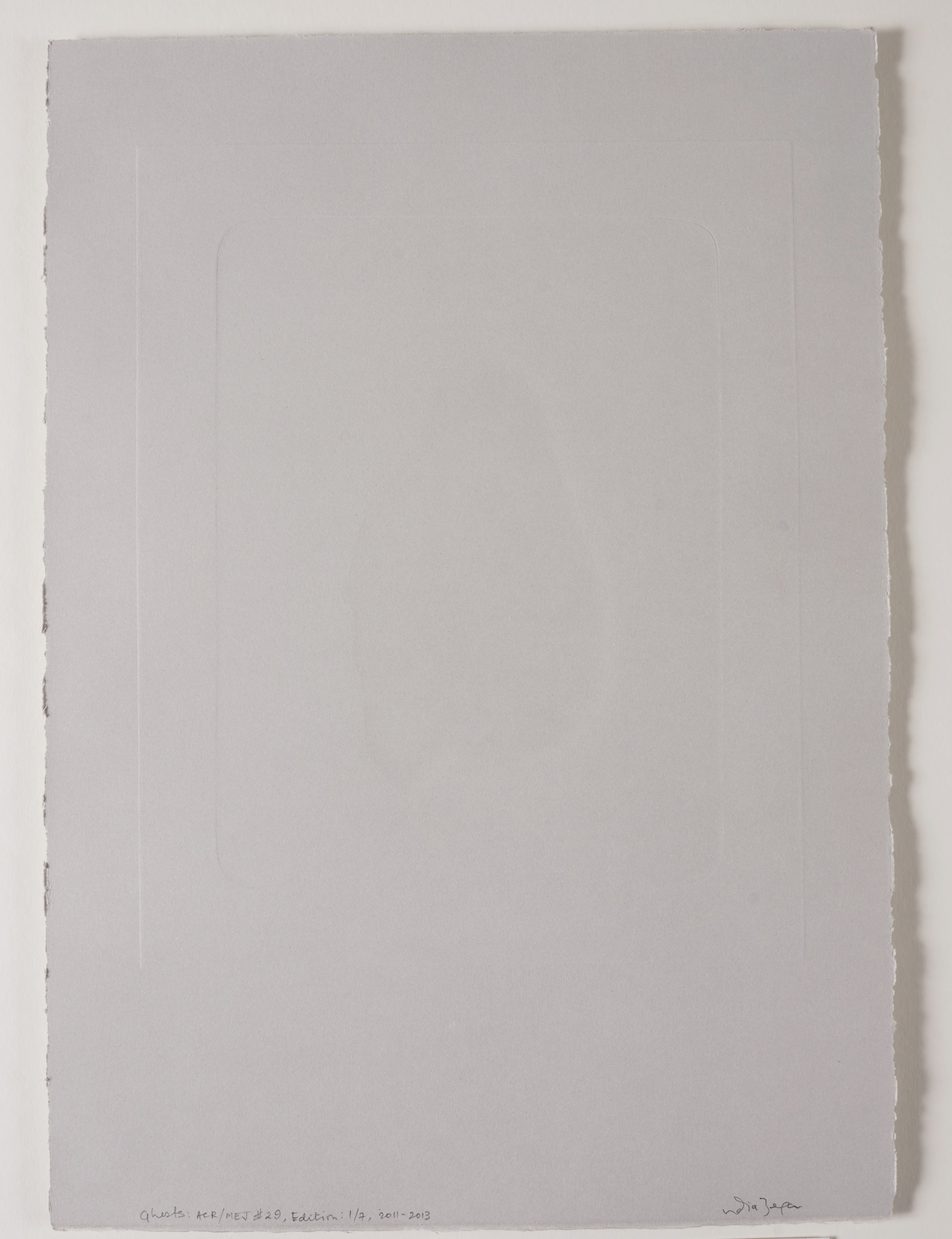 India Zegan ‘Museum of Fathers # 26-37: Ghosts ACR/MEJ’ 2013, blind embossed woodcut prints, archival Magnani Pescia paper, 41 x29cm (paper size). Printed by Nick Summers, Plum Letterpress, edition: 2x A/P; 1x Printers copy; Edition: 1-7. Photo: Felicity Jenkins